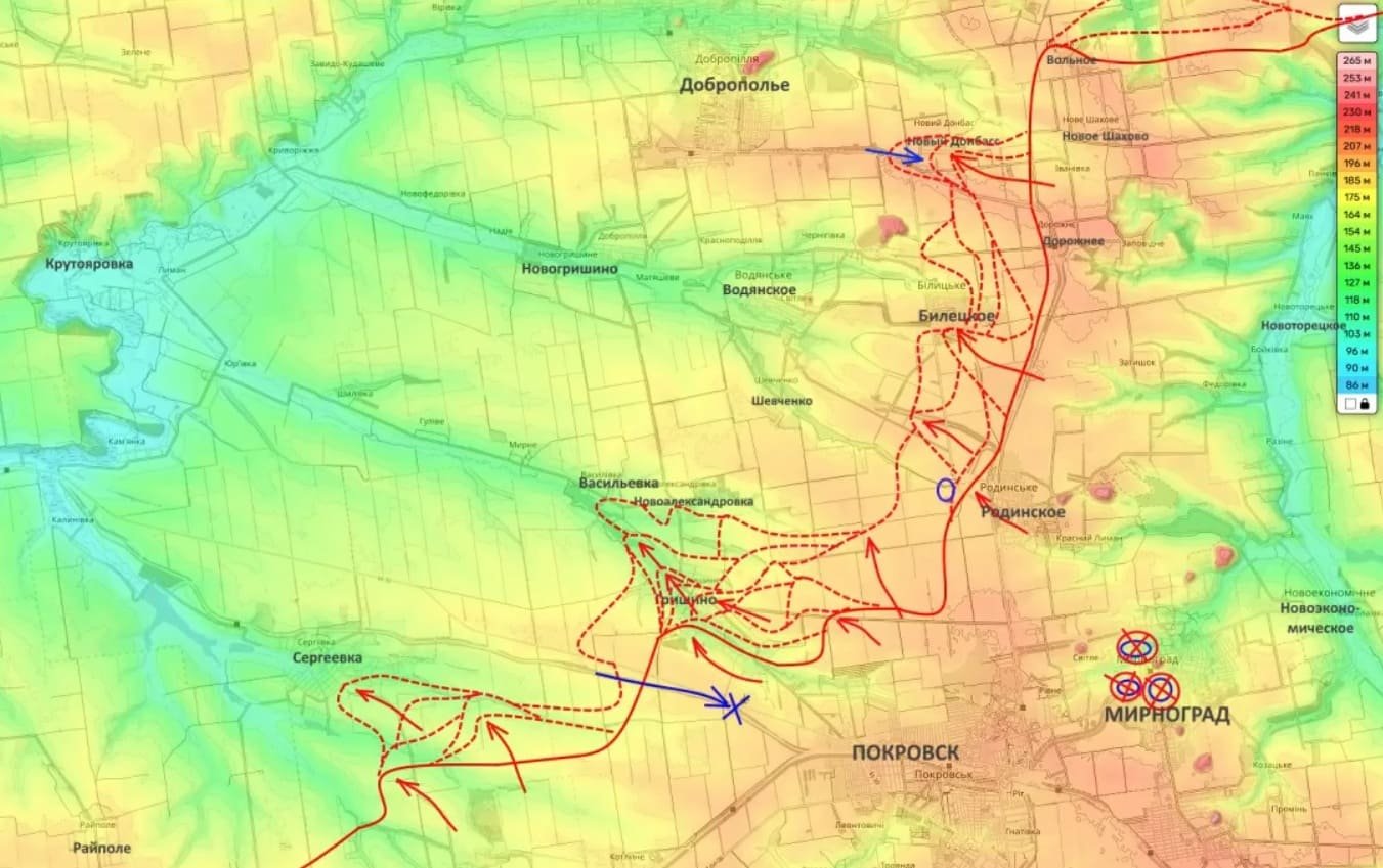 На Покровском направлении обстановка тоже остаётся жёсткой. Несколькими днями ранее, как пишет Подоляка, противник предпринял неудачную попытку контрнаступления и потерял около двух взводов, не сумев решить задачу по прорыву в сторону Покровска. Сейчас, по его данным, российские подразделения дочищают Гришино, а также продолжают бои в Новоалександровке и Васильевке. Ещё одной горячей точкой он называет Билецкое и Новый Донбасс.