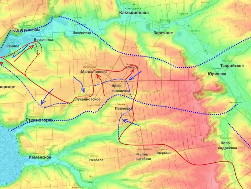 В зоне действий группировки «Днепр» ВСУ не сидят сложа руки. Они продолжают атаковать из выступа северо-восточнее Степногорска и пытаются выбить наших из Лукьяновского. Подоляка объясняет: украинские формирования хотят подрезать тот выступ, который мы пробили в их обороне зимой. Цель — занять Степногорск и свести на нет все наши успехи той кампании.