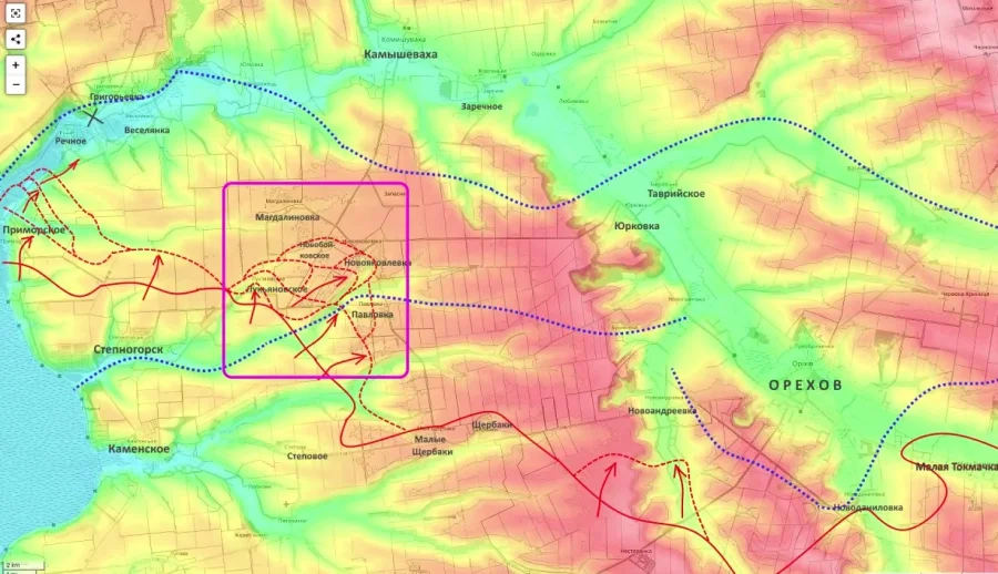 Сообщения о продвижении подтверждаются и украинскими аналитическими ресурсами. Проект Deep State (DS) указывает, что российские подразделения контролируют южную часть Степногорска и действуют малыми группами в районе Приморского. По этим оценкам, расстояние до окраин Запорожья сократилось до менее чем 15 километров.