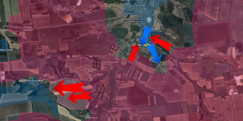 Обстановка на Шаховском направлении: За последние четыре дня украинской армии удалось стабилизировать обстановку в районе Шахового и вновь войти в северную часть Владимировки до складов. С другой стороны, российской армии удалось вновь войти в Новое Шаховое и вернуть его под свой контроль.