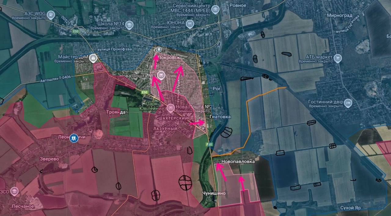 Последние 48 часов ряд украинских источников сообщает, что войскам РФ удалось существенно продвинуться в Покровске. По некоторым сведениям, удалось даже перескочить железную дорогу, чуть западнее школы №14, однако подтвердить эту информацию пока не получается. Однако вне зависимости от того, есть ли продвижение за железной дорогой, есть существенный прогресс в центре города, что фактически говорит о начале коллапса обороны ВСУ в жилой застройке. Повозиться здесь российской армии ещё придётся, однако если успех удастся развить с юга на север, то в окружении может оказаться мирноградская группировка ВСУ, — Военная Хроника.
