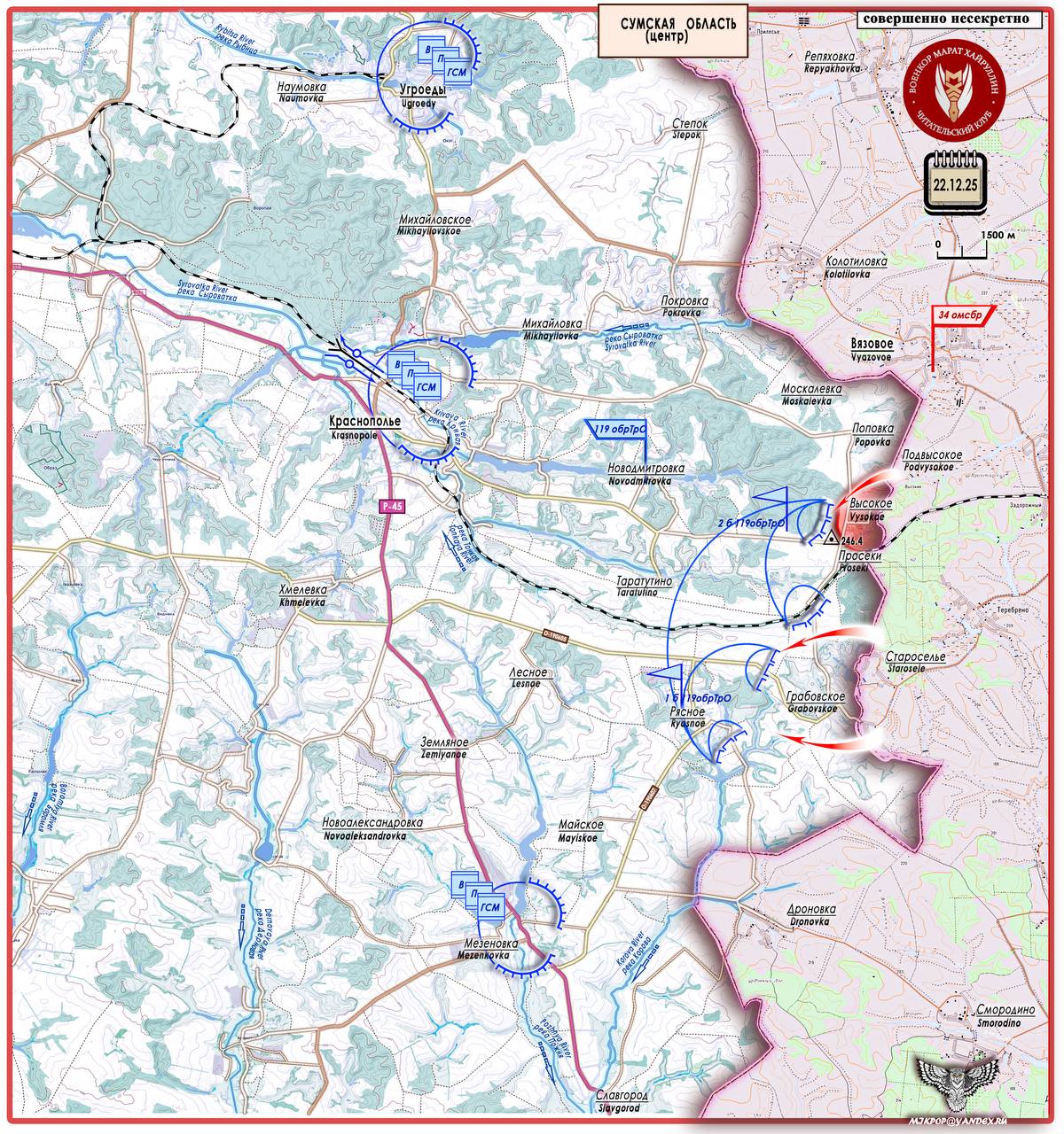 По его информации, российские войска начали активные действия ещё на одном участке государственной границы — в соседней Сумской области. 20 декабря был освобождён населённый пункт Высокое, расположенный на востоке центральной части региона. В течение 22 декабря поступали сообщения об активных действиях российских штурмовых подразделений южнее Высокого, на направлении Грабовское — Рясное. Отмечается заход в эти населённые пункты и пленение военнослужащих 119-й бригады территориальной обороны.