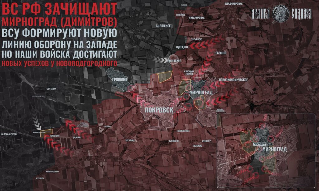 Кольцо вокруг гарнизона Мирнограда сжимается. Российские войска заняли большую часть западных подступов к городу и теперь наступают на него в том числе с этой стороны.