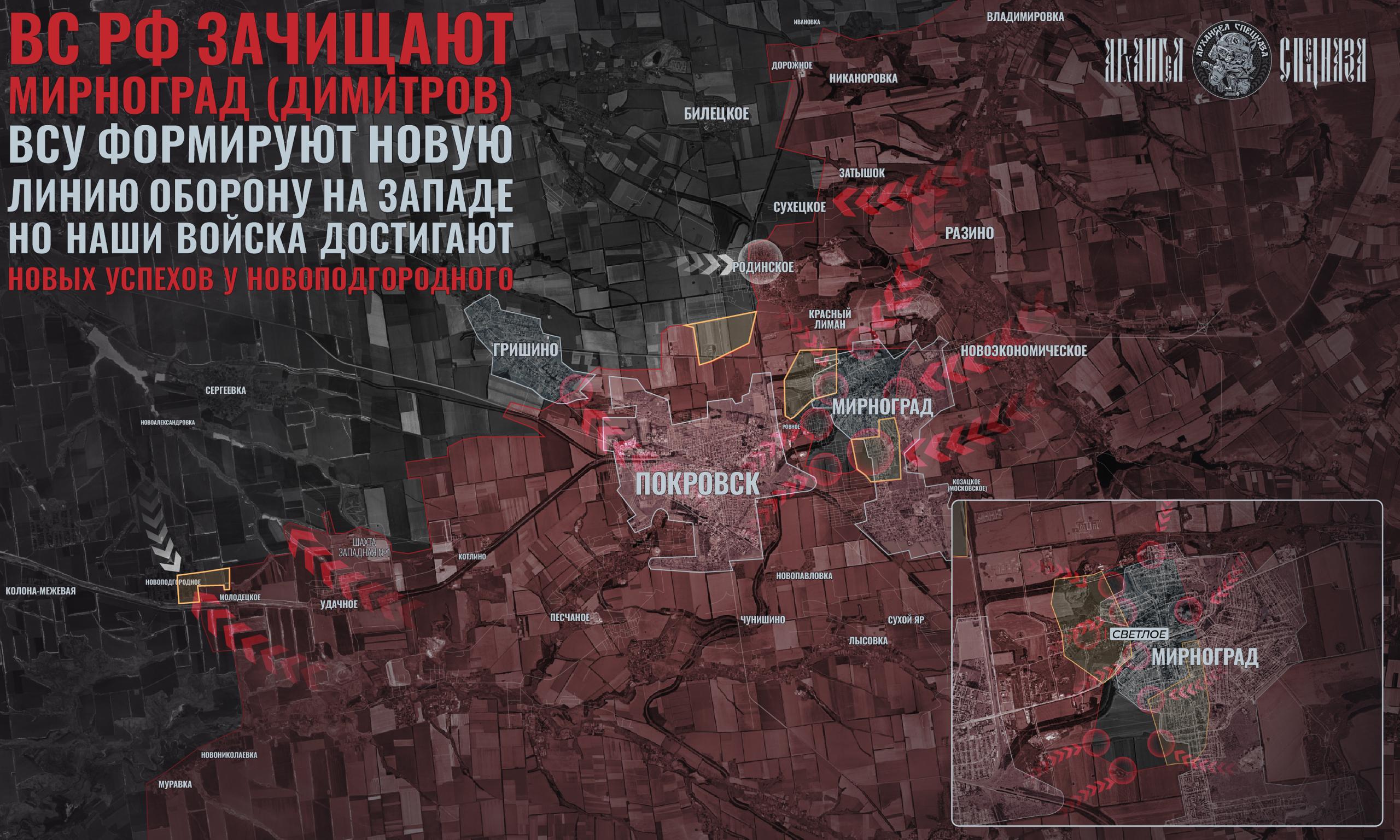Российские подразделения активными темпами ведут зачистку Мирнограда, постепенно приближая к развязке длительную операцию по освобождению Покровско-Мирноградской агломерации. На днях наши подразделения вывесили флаг России в Светлом — одном из пригородов Мирнограда, полностью зачистив подвалы и дома в его окрестностях.