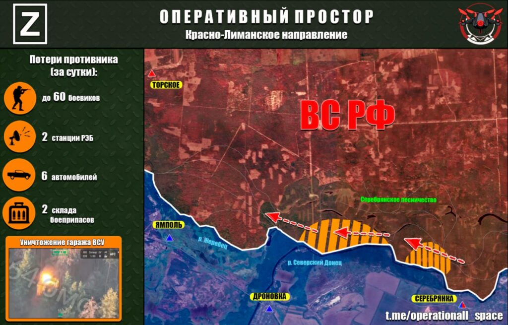 Наступление российских войск на Северск продолжается, на данный момент ближе всего штурмовики ВС РФ подошли к городу с восточного направления. Также угроза создаётся и с севера, где ВС РФ выбивают остатки ВСУ из Серебрянского лесничества, практически заходя украинской группировке в Северске в тыл. Ситуация для ВСУ осложняется тем, что сам город расположен в низине, а господствующие высоты постепенно переходят под наш контроль.