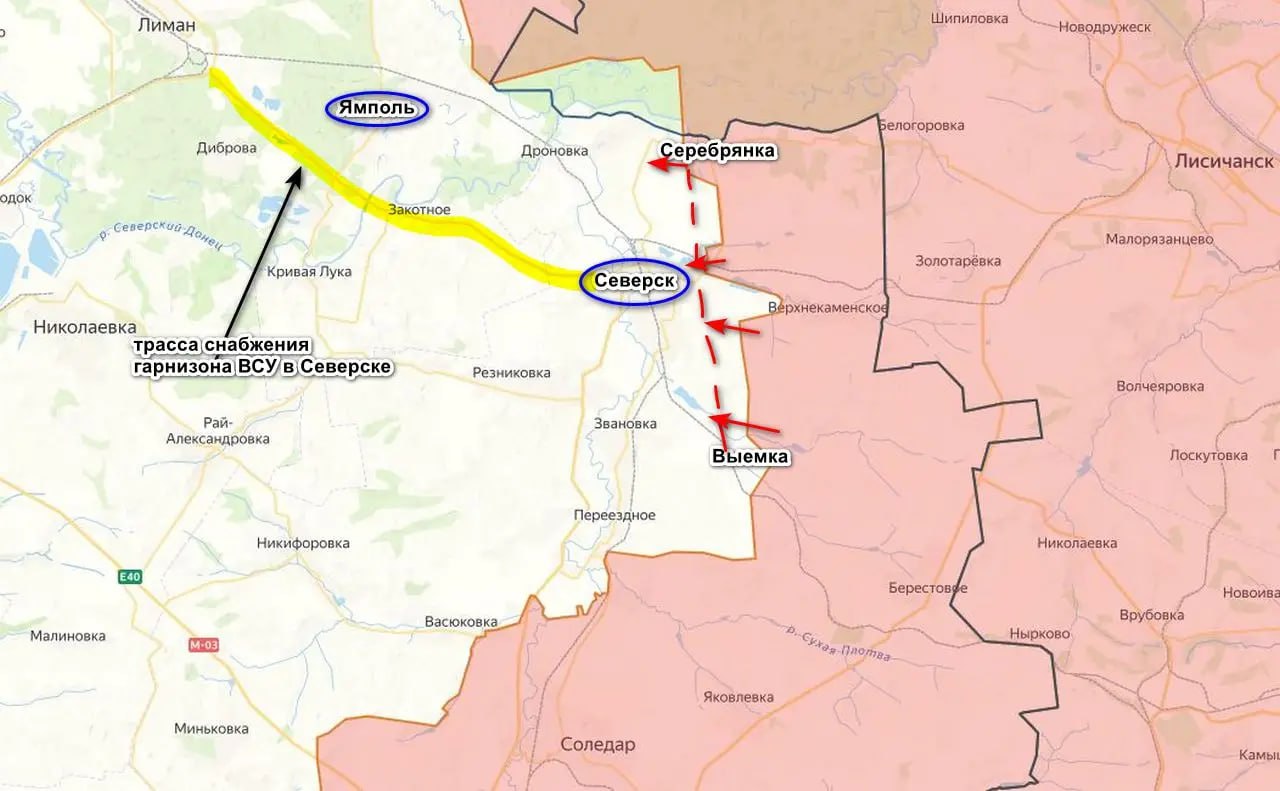 Наступление российских войск на Северск продолжается, на данный момент ближе всего штурмовики ВС РФ подошли к городу с восточного направления. Также угроза создаётся и с севера, где ВС РФ выбивают остатки ВСУ из Серебрянского лесничества, практически заходя украинской группировке в Северске в тыл. Ситуация для ВСУ осложняется тем, что сам город расположен в низине, а господствующие высоты постепенно переходят под наш контроль.