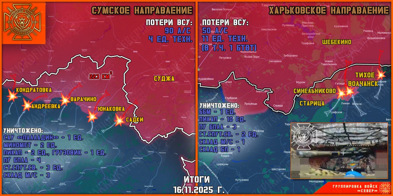 На участке фронта Меловое-Хатнее Воины Севера расширили зону безопасности возле российской границы, продвинувшись на 500 м. Российская авиация и расчеты ТОС-1А поразили позиции 3 отмбр ВСУ в районах Катериновки и Двуречанского. На Липцовском участке фронта без существенных изменений. Артиллерия и расчеты FPV группировки «Север» выявляли и уничтожали транспорт и бронетехнику ВСУ на маршрутах снабжения в Липцах и окрестностях, — Северный Ветер.