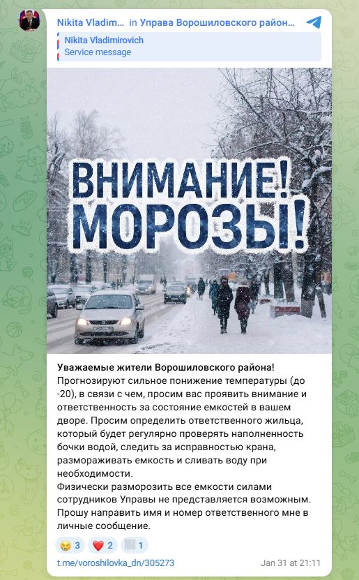Физически разморозить все емкости силами сотрудников Управы не представляется возможным», — сообщил управляющий делами Управы Ворошиловского внутригородского района Администрации городского округа Донецк Донецкой Народной Республики Никита Владимирович Тарасов.