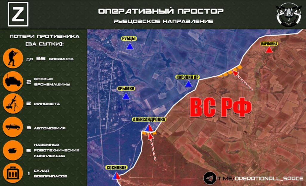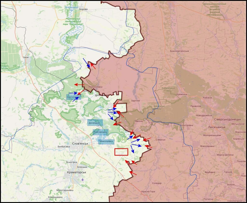 Северский участок фронта: Подразделения ВС РФ вышли к реке Северский Донец со стороны Озёрного, закрепляясь на подступах к водному рубежу и усиливая огневой контроль над прилегающими участками. В результате давления на оборонительные позиции противника подразделениям ВС РФ удалось зайти в Кривую Луку с восточного направления. Ведутся бои за закрепление в пределах населённого пункта. Подразделения ВС РФ продвинулись севернее Резниковки, расширяя «серую зону» и усиливая давление на оборону противника в глубину направления, — Донбасский Партизан.