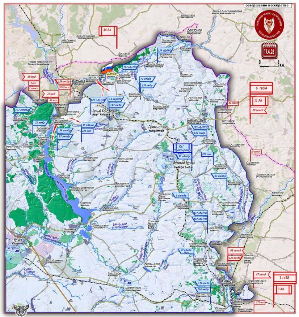 После этого, следуя тактике «рвите шаровары в гопаке» или, как мы это называем, «шпагата», начнется вбивание клиньев в линию обороны врага на рассекающих направлениях: вдоль левого берега Печенежского водохранилища, на линиях Вильча — Белый Колодезь, Караичное — Белый Колодезь, Нестерное — Резниково, с поддержкой от соединений восточного фаса в районе Артельное — Рубленое и Чугуновка — Ольховатка.