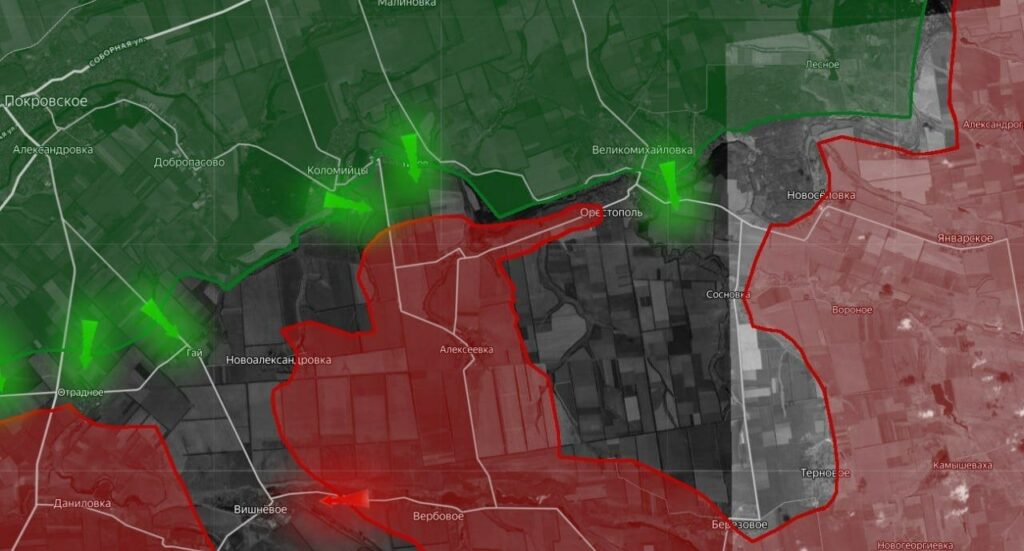 Подразделения группировки войск «Восток» продолжили успешные наступательные действия в заданных направлениях: На северном участке продолжается расширение зоны контроля северо-западнее н.п. Александроград, продолжаются ожесточенные бои в лесном массиве за р. Волчья, где противник ведет активную оборону. Ударными FPV-дронами и артиллерией продолжается нанесение поражения по позициям и местам дислокации ВСУ в н.п. Гавриловка, Великомихайловка, Коломийцы.