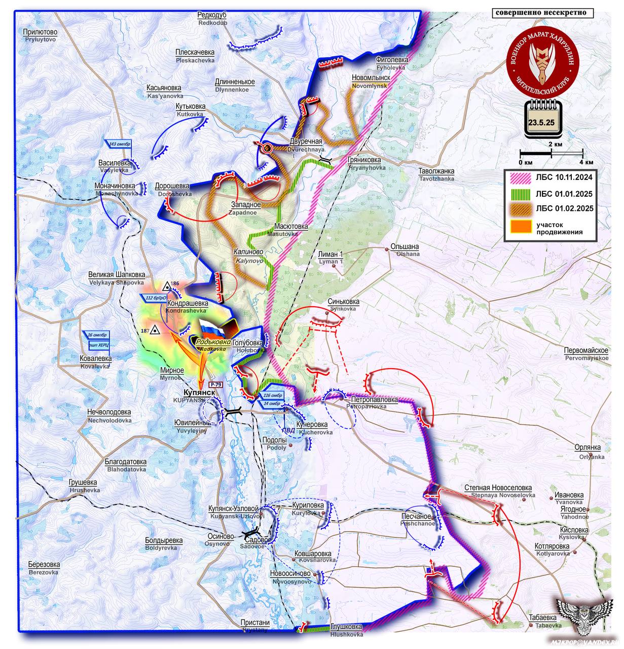 Хорошие новости поступают с Купянского направления. МО РФ сообщило об освобождении села Радьковка, что южнее Кондрашовки. От него до первых домов Купянска – около 1 км, то есть ВС РФ фактически вышли к северо-западным окраинам Купянска.