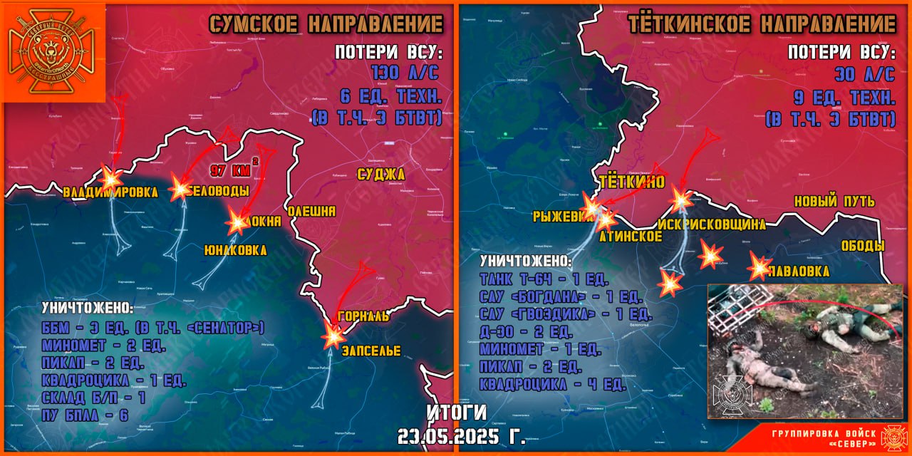 Из Сумской области ВСУ продолжают атаки в районе Тёткино и Нового Пути Курской области, теряют технику и людей, успехов при этом не имеют. Вчера вечером враг нанёс ракетный удар по Льгову, десятки домов повреждены, 16 человек было ранено.