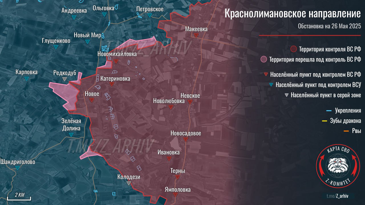 На Времьевском направлении ВС РФ ведут штурм Зелёного поля — присутствие российских военных фиксируется уже в центральной части села. Также продолжаются бои за Новополь, где российские подразделения захватили одну из важных высот. Обстановка на данном участке фронта остаётся динамичной.