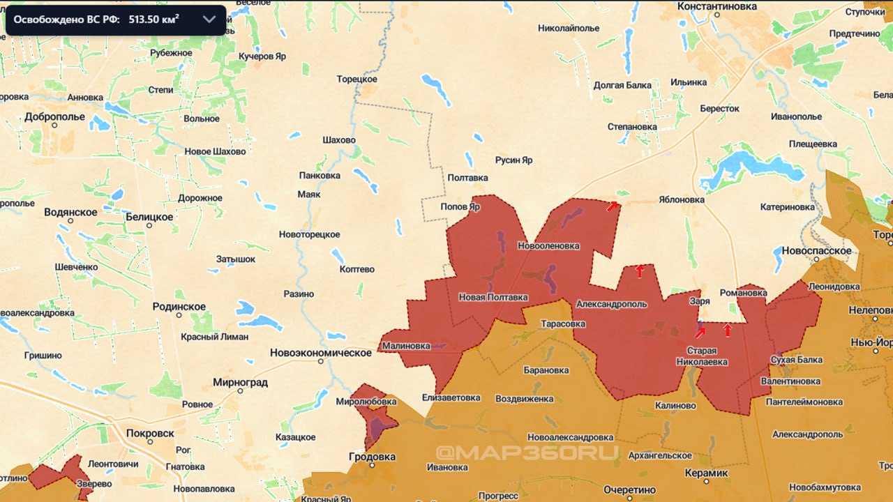 Штурмовые подразделения ВС РФ смогли достичь населённого пункта Попов Яр и закрепиться в жилой застройке. Передовые позиции в центре посёлка были обстреляны ВСУ. Продвижение ВС РФ на восточном охвате Красноармейска (Покровска) около 1,5 км.