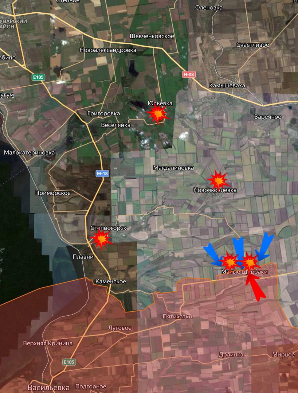 ВС РФ наращивает удары дронами и возобновляет штурмы к северу от Александрополя. Как сообщает противник, российские войска движутся в сторону Яблоновки — за западную часть этого села уже ведутся серьезные бои.