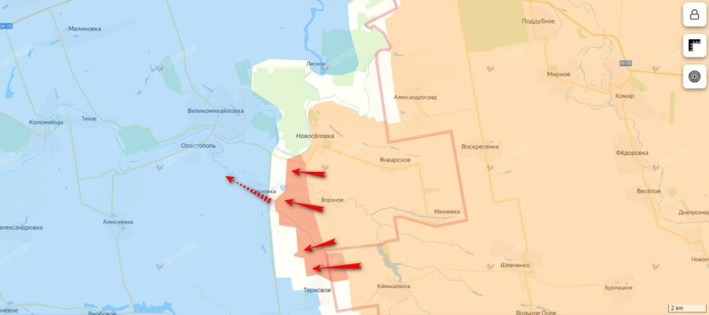 В районе Великомихайловки продолжаются ожесточённые бои. Российские подразделения оказывают давление из лесных массивов восточнее населённого пункта. Часть территории превратилась в «серую зону» с постоянными боестолкновениями и подвижной линией фронта. Такая динамика создаёт перспективу охвата населённого пункта с востока и юго-востока, особенно в случае синхронизации действий с наступлением в районе Орестополя.