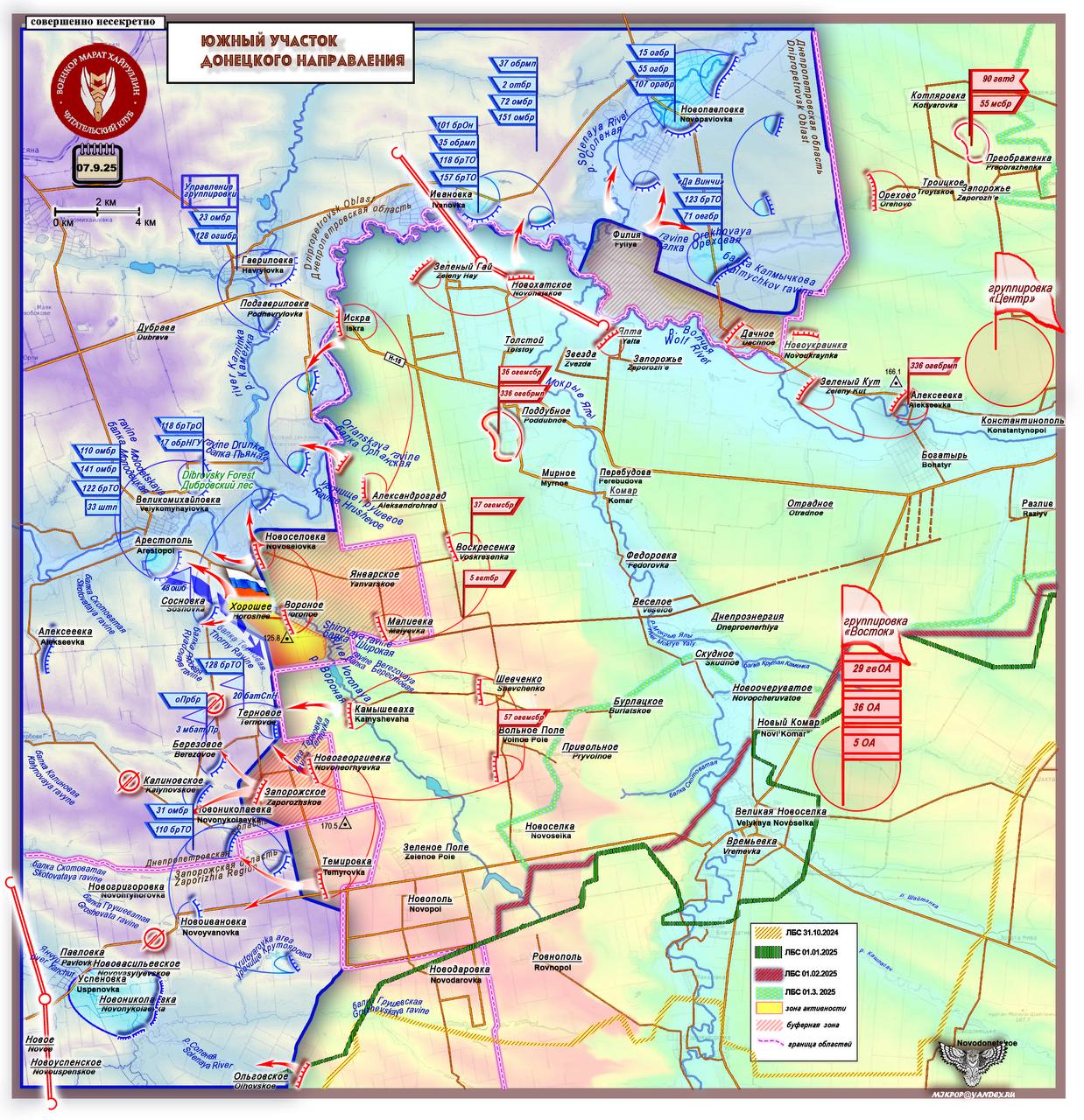 На Южно-Днепропетровском направлении российские войска развивают наступление сразу на нескольких ключевых участках, используя тактику маневренных действий малыми группами, работу ДРГ, дронов и артиллерии. Основная цель — дестабилизировать оборону противника и выйти на рубежи, прикрывающие Великомихайловку.