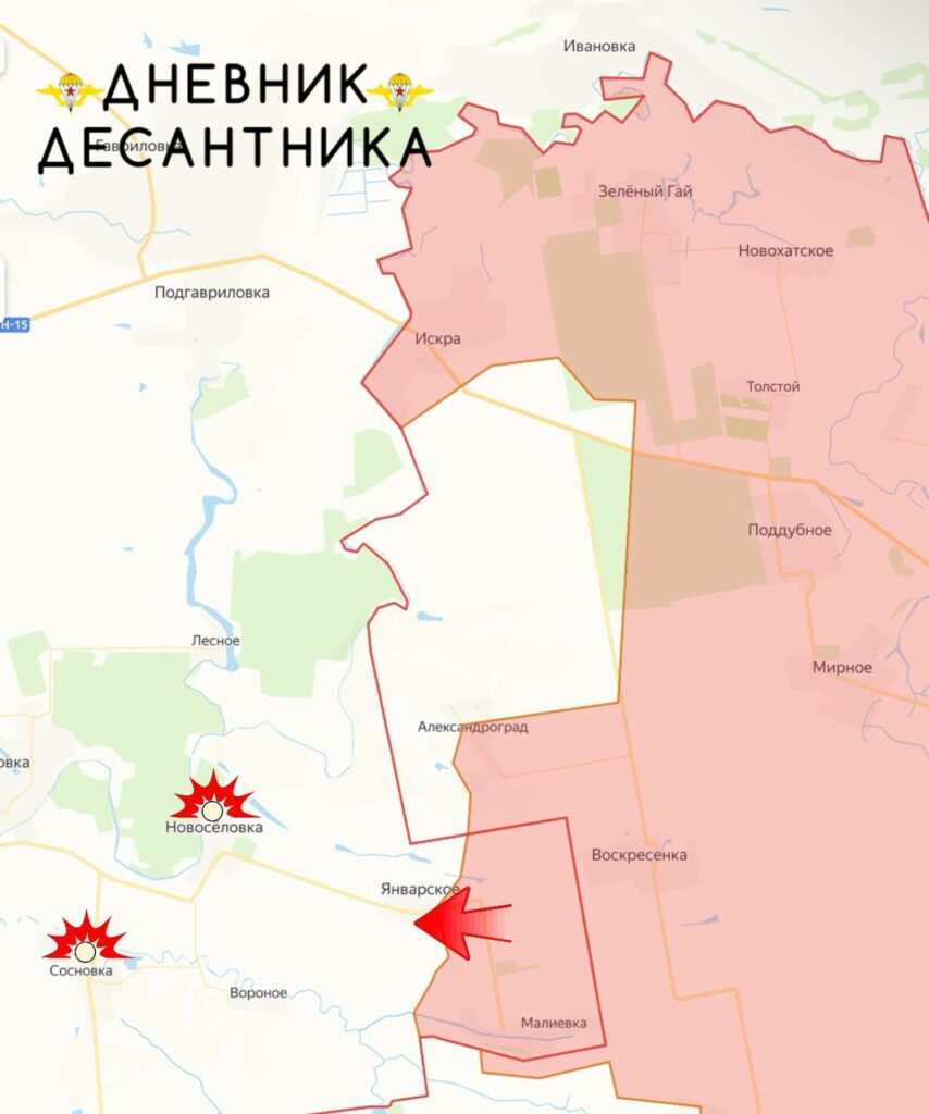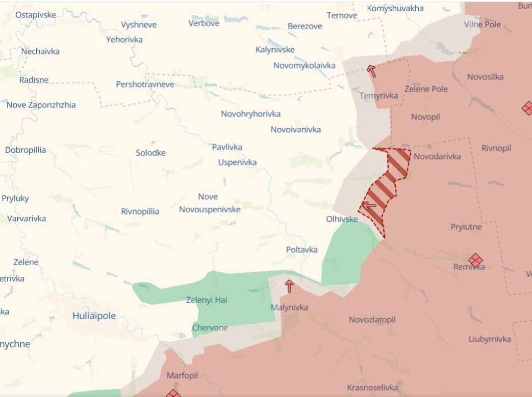 Севернее Полтавки подразделения ВС РФ развивают наступательные действия малыми штурмовыми группами при плотной поддержке артиллерии и авиации. Цель — выход к дорогам, обеспечивающим снабжение украинской обороны, что создаёт угрозу изоляции укрепрайонов противника и дезорганизации его командных пунктов. Атаки идут по посадкам и балкам, где манёвренность российских подразделений осложняет оборону ВСУ.