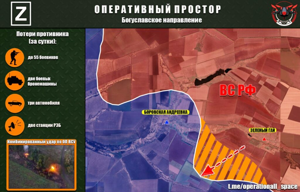 ВС РФ улучшили тактическое положение по охвату населенного пункта Боровская Андреевка. Комбинированные удары ГрВ «Запад» с применением бомбардировочной и армейской авиации, артиллерии крупного калибра и тяжелых огнеметных систем, барражирующих боеприпасов и ударных БпЛА заставили подразделения иностранных наемников ВСУ беспорядочно отступать на правый берег реки Оскол.