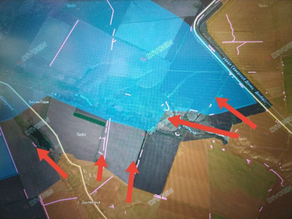 Восточнее наши подразделения выбили противника из опорного пункта между каналом и р. Наумиха и вышли к восточной окраине Белой Горы.