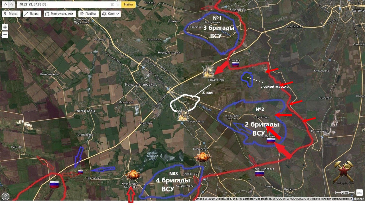 Сдерживает наше наступление хорошо укрепленный лесной массив южнее Ступочек, где враг планирует (или хотел спланировать) повторить чудо Серебрянского леса. Севернее Предтечино в большой укреп пока не можем зайти по объективным причинам, хотя противник там уже отсутствует или в следовых количествах.