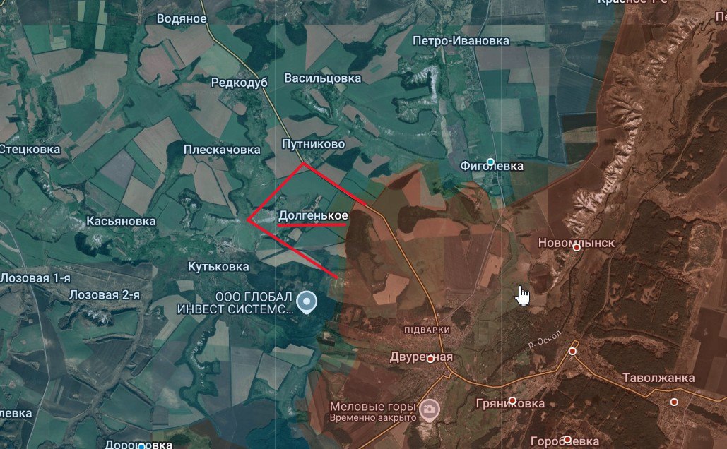 Долгенькое – село в Купянском районе Харьковской. Расположено в 5 километрах к северо-западу от ранее освобожденной Двуречной. Плацдарм группировки «Запад» на правом берегу реки Оскол продолжает расширяться и углубляться. В ближайшее время стоит ожидать наступления на расположенные рядом Кутьковку, Путниково и Редкодуб. Кроме того, с этого плацдарма можно наступать на юг в сторону Купянска.