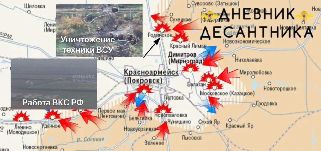 От передовых позиций ВС РФ в Родинском до позиций в Покровске – всего 6 км. Известно, что ВСУ уже испытывают серьезные проблемы со снабжением в Покровске и Мирнограде, а попытки прорыва украинцев на лёгких бронемашинах к своим приводят лишь к большим потерям. Так, 11 октябре в сети разошлось видео, где на коротком отрезке дороги между Родинским и Покровском сняли сразу 16 сгоревших ББМ ВСУ.