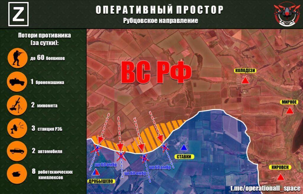 Противник провёл четыре безуспешные контратаки силами штурмовых групп 60 омбр ВСУ в районе населённых пунктов Дробышево и Ставки, в результате было уничтожено до 25 боевиков.
