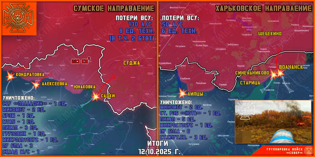 В Сумском приграничье ВС РФ с тяжелыми боями прорывается в районе Алексеевки. Восстановлен контроль над Варачино. Поражены позиции ВСУ в районе Андреевки, Павловки, Новой Сечи и Садков. На всем участке фронта в Сумской области ожесточенные бои. Штурмовые подразделения Северян продвигаются по лесополосам, российская авиация и артиллерия группировки «Север» круглосуточно наносят удары по выявленным скоплениям живой силы ВСУ. Противник контратакует, не жалея личного состава.