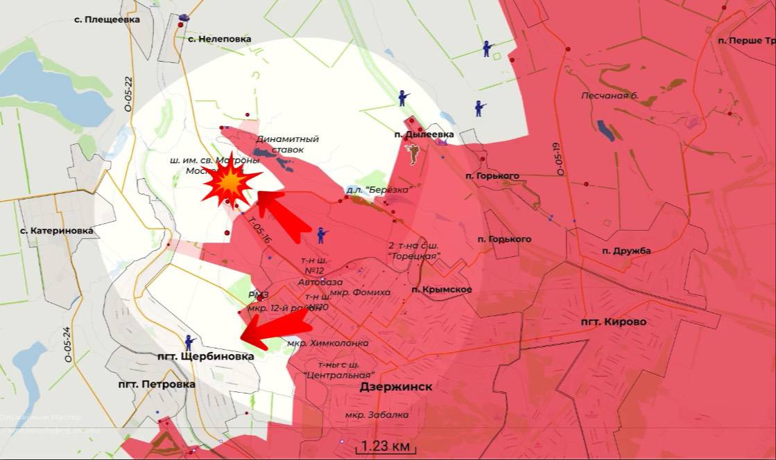 Противник с северо-западной стороны попытался в ходе контратаки отбить утраченные позиции у шахты им. Св. Матроны Московской, операторы БПЛА из 103-го полка отбили атаку, в ходе чего уничтожили вражескую бронемашину и группу из 5 человек. Помимо этого, дистанционно минируем подъезды к участку, для пресечения вражеских атак. Наши войска продвинулись в данном направлении на 2,5 км. Также продвинулись наши войска и в направлении Щербиновки, — Дневник Десантника
