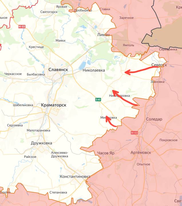 Общая ситуация: Северское направление остаётся самым активным, с точки зрения продвижения ВС РФ. Освобождено больше половины города Северск. Бои идут в западной части города. Есть успехи в продвижении на южном участке, в Кирово (Свято-Покровском) и на северном участке от Закотного в сторону трассы Т-05-13.