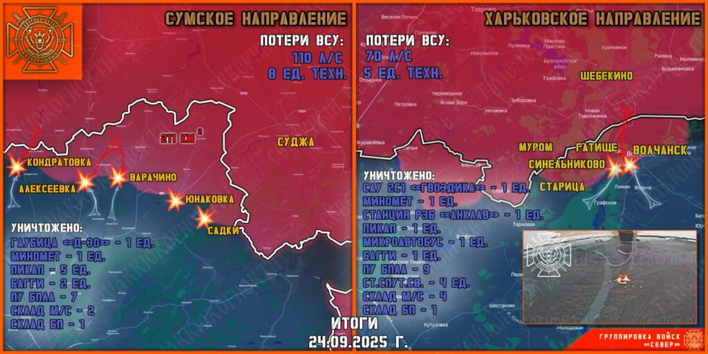 Противник провел семь контратак штурмовыми группами 225 ошп, усиленными личным составом 158 омбр: пять в районе Алексеевки и по одной в районе Варачино и Кондратовки. Успеха не имел. В ходе отражения уничтожено до взвода живой силы противника, двое взято в плен. Кроме того, огнем артиллерии и ударами дронов сорваны две попытки выдвижения на позиции ВСУ в районе Юнаковки и Алексеевки. На Теткинском и Глушковском участках фронта без существенных изменений. Авиация ВКС РФ и артиллерия группировки «Север» наносили удары по выявленным целям противника.