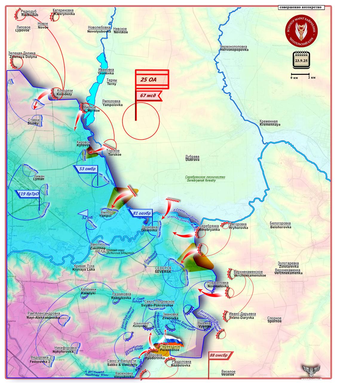 На участке фронта Меловое-Хатнее за сутки Воины Севера, при поддержке авиации ВКС РФ, артиллерии и ТОСов, продвинулись на 400 м. На Липцовском участке фронта без существенных изменений. Противник активных действий не предпринимал. Расчеты FPV группировки «Север» наносили удары по ПУ БпЛА и пунктам дислокации 92 ошбр ВСУ и 13 брон НГУ. В 92 ошбр ВСУ практически полностью уничтожены подразделения «Шквал», состоящие из бывших заключенных. Они составляли основную ударную силу в бригаде, в результате чего ее наступательный потенциал значительно снизился, — Северный Ветер. 1. Пришла привязка, подтверждающая освобождение Отрадного.