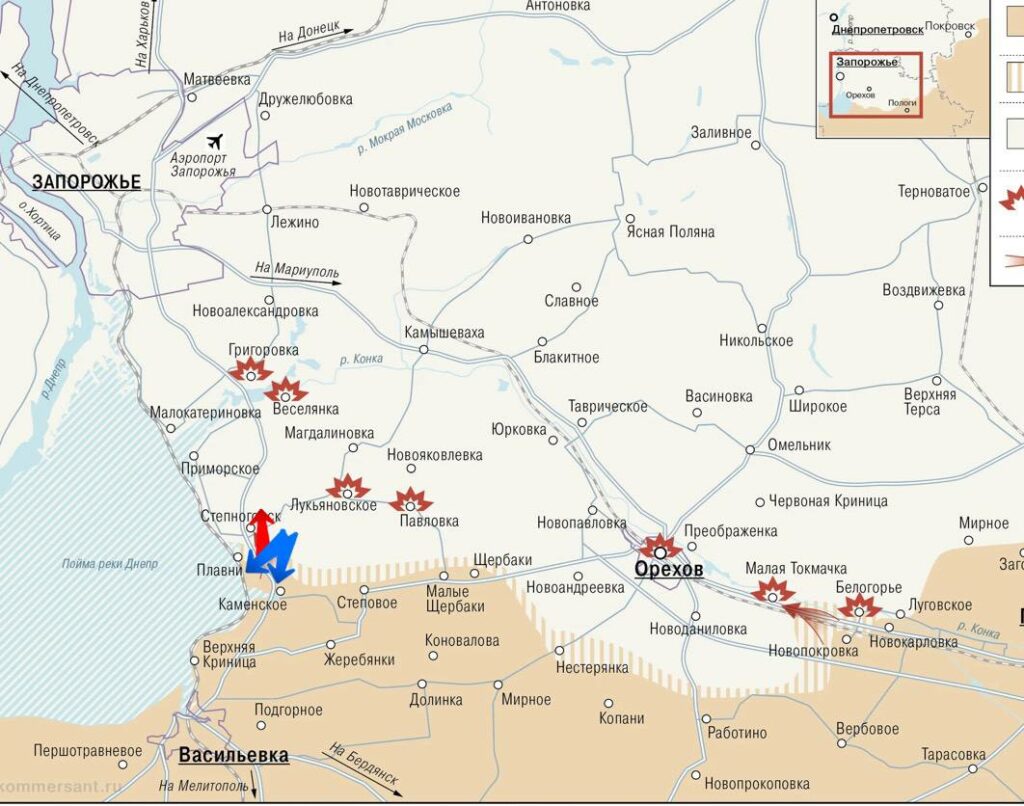 На Запорожском участке продолжаются бои в районе 3-его мкр. Степногорска в южной части посёлка. В Плавнях продолжаются позиционные бои. В районе Орехово не утихают бои в Нестерянке, Новоданиловке и Малой Токмачке. Противник вчера обстрелял Каменку-Днепровскую.