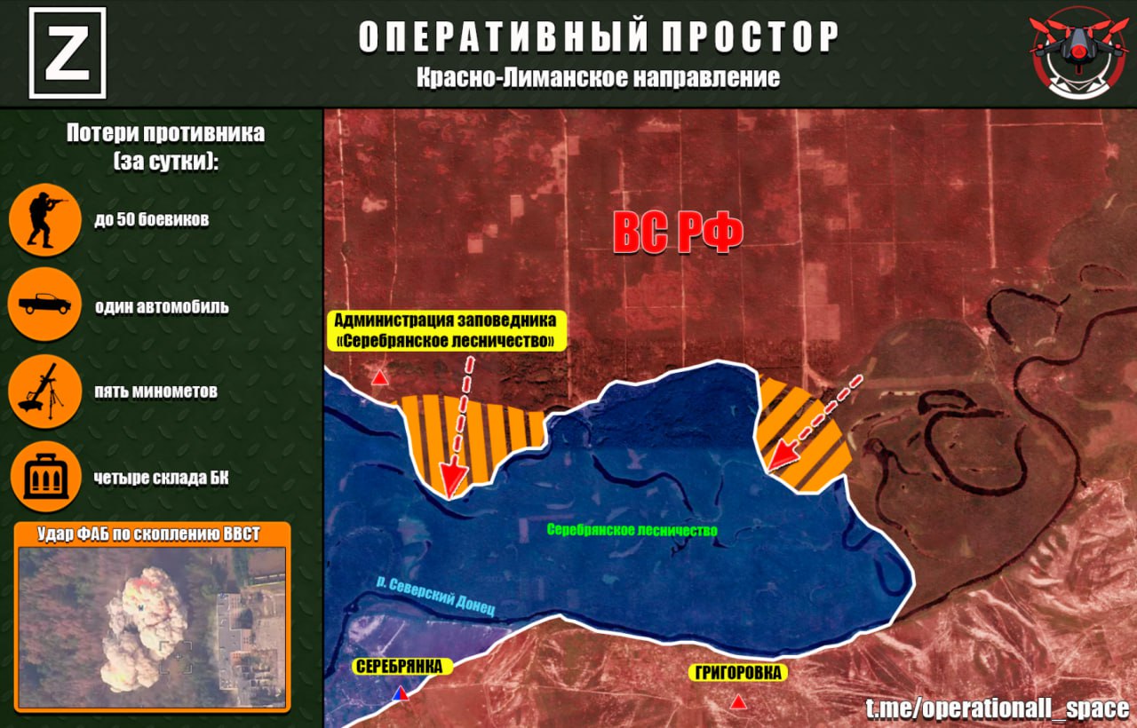 На Краснолиманском направлении Торское практически освобождено, ВС РФ штурмуют Заречное, форсировав р. Жеребец. Ресурсы противника признают мощное продвижение наших бойцов на территории Кременских лесов в направлении Серебрянки. Бои идут в Среднем и Шендриголово.