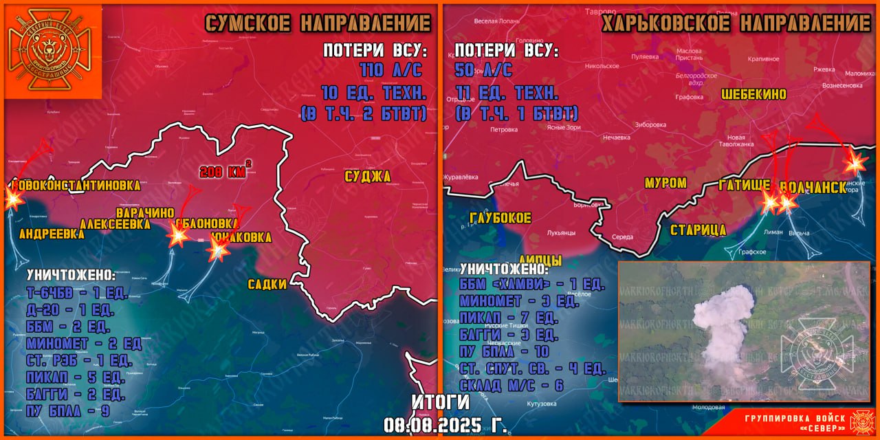 На Сумском направлении оперативная пауза, но позиционные бои в районе Кондратовки, Алексеевки и Андреевки продолжаются. В Юнаковке с тяжёлыми боями ВС РФ продвигаются в селе и восточнее него.