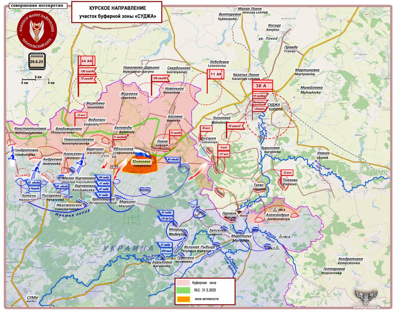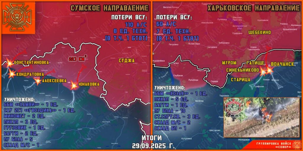 В Сумском приграничье ВС РФ закрепились западнее Юнаковки, есть продвижение в районе Кондратовки. Противник предпринял несколько контратак в районе Алексеевки, но не имел успеха, понёс потери и отступил. По всему участку фронта авиация ВКС РФ и артиллерия группировки «Север» наносили удары по выявленным скоплениям живой силы ВСУ. Подразделения ВДВ и морской пехоты продолжали продвижение вглубь Сумской области. Враг контратаковал правый фланг наступающей группировки Северян.
