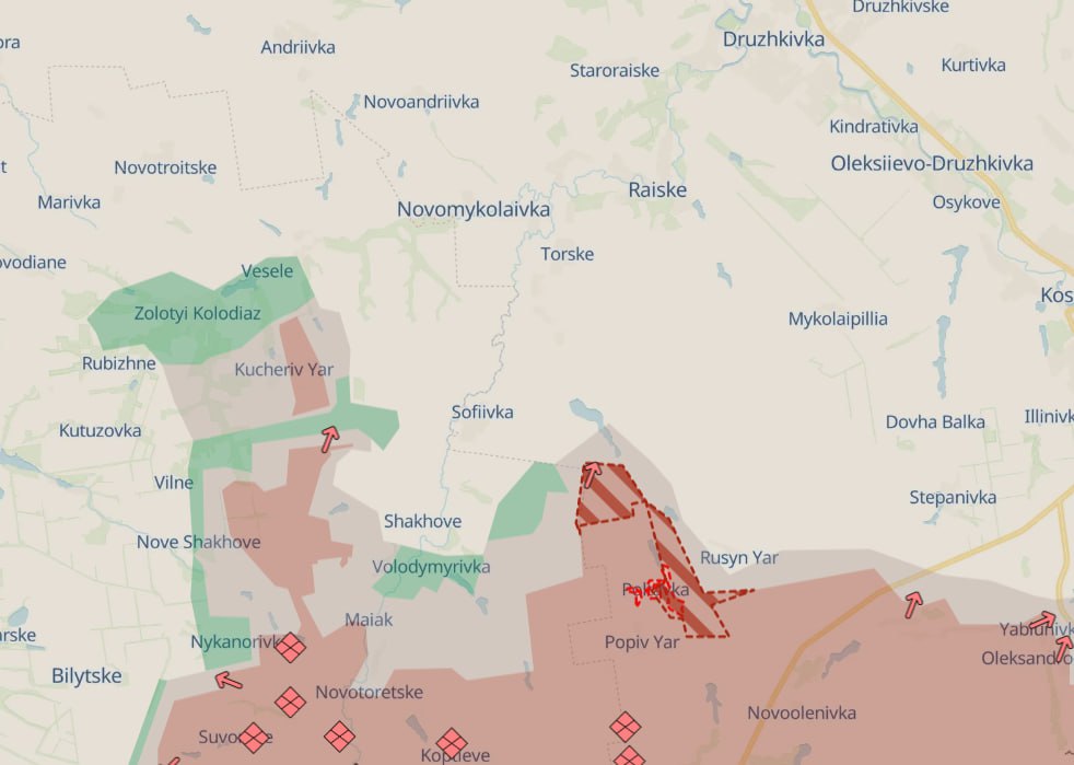 На Константиновском направлении тактические успехи есть западнее Русина Яра. Южнее Клебан-Быкского водохранилища ВС РФ продолжают истреблять остатки гарнизона противника в Клебан-Быке и Катериновке. Западнее Часов Яра ВС РФ зачищают опорники противника и продвигаются на запад.