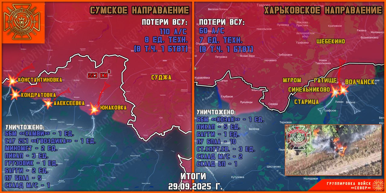 В ходе отражения атаки в районе Константиновки штурмовая группа противника полностью уничтожена. Кроме того, враг потерял одну ББМ «Хамви». В результате безуспешных атак возле Кондратовки и Алексеевки, враг потерял более 50% личного состава штурмовых групп. На Теткинском и Глушковском участках фронта без существенных изменений. Артиллерия Северян и расчеты БпЛА наносили удары по маршрутам снабжения врага.