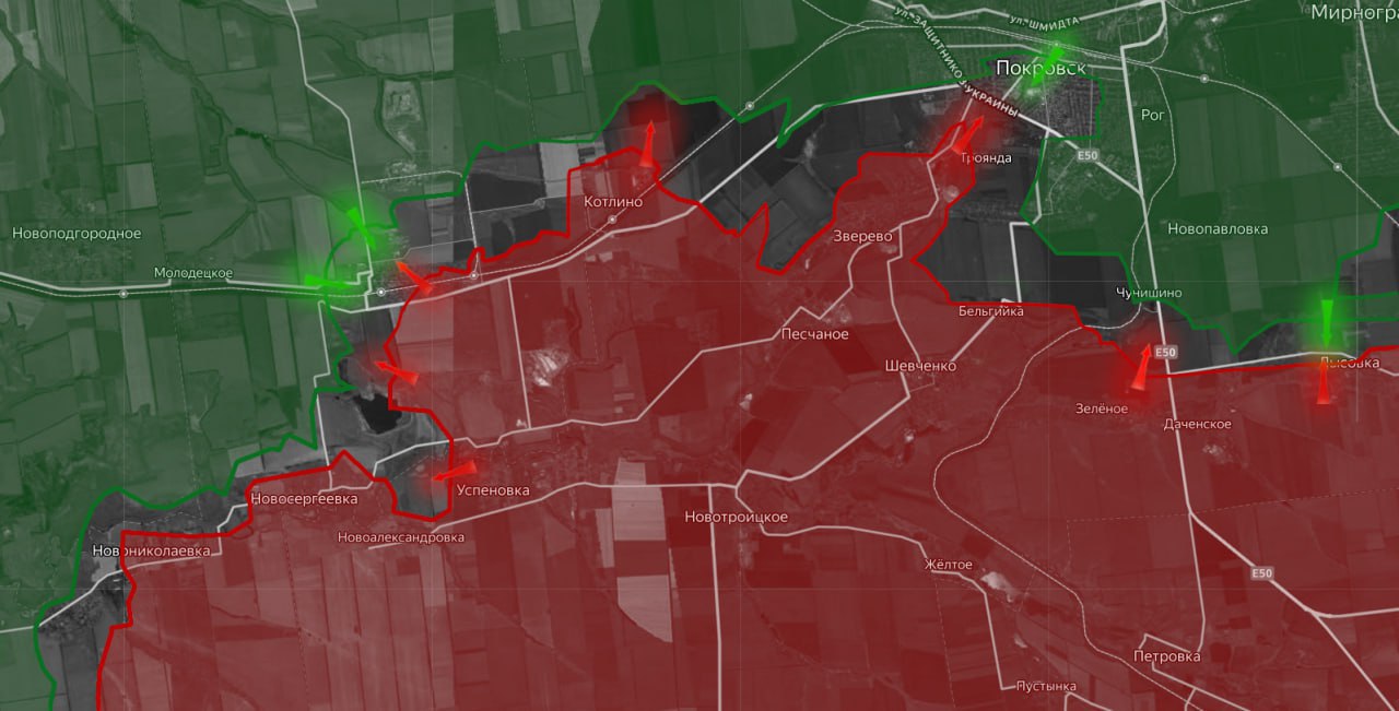 На Покровском фронте ВС РФ закрепились на восточной окраине Муравки, ключевым населённым пунктом для развития наступления на Новопавловку. С юго-запада от Новопавловки есть успехи севернее Филии. В Удачном идут ожесточённые встречные бои. Наши бойцы малыми группами продолжают проникать на территорию Покровска. Очень интенсивное сражение в районе Чунишино. На восточном фланге ВСУ держат рубежи в Новоэкономическом. Сообщают, что враг смог потеснить ВС РФ западнее Родинского и южнее Красного Лимана, а также активно контратакует в районе Никоноровки, Владимировки и Новоторецкого.