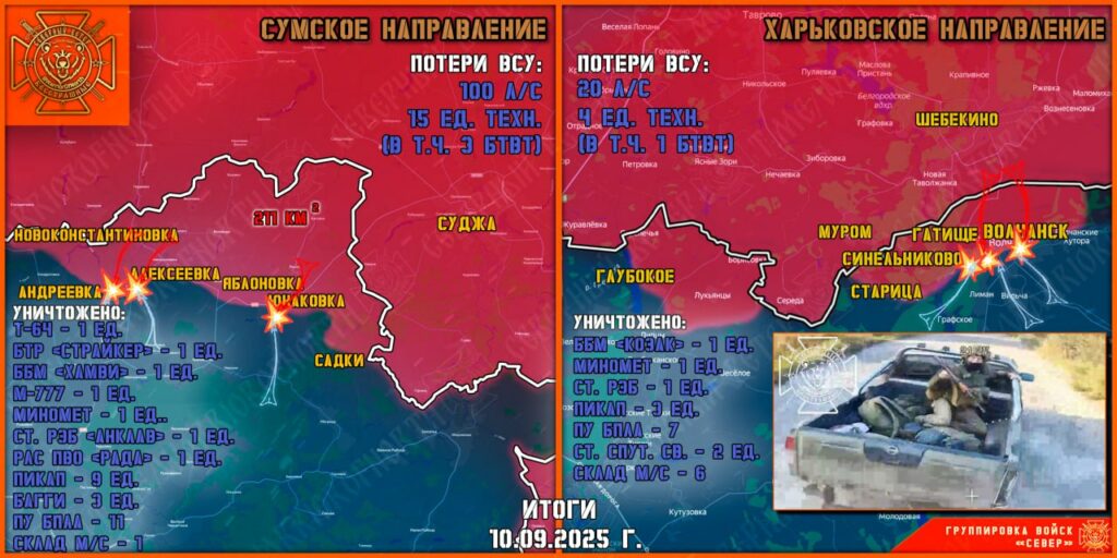 В Сумском приграничье ВСУ упорно контратакуют в районе южной окраины Юнаковки, наши рубежи держат. Также несколько контратак было в районе Андреевки и Алексеевки. Авиация ВКС РФ, расчеты БпЛА и артиллерия группировки «Север» продолжали наносить удары на всем участке фронта в Сумской области. Ожесточенные бои на юге Юнаковки и в окрестностях. Противник перебрасывает подкрепления, в том числе спецназ. За сутки Северяне отразили две контратаки ВСУ в районе Андреевки и Алексеевки. Враг задействовал штурмовые группы из состава 225 ошп и 78 одшп при поддержке западной бронетехники и артиллерии. В ходе отражения уничтожены танк, БТР и ББМ.