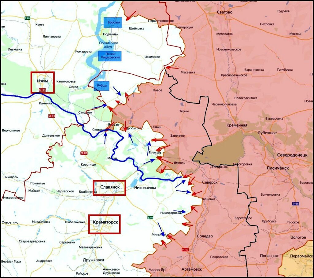 На Краснолиманском участке активные боевые действия идут на севере от Красного Лимана. Гвардейцы наступают на восточной окраине Дробышево – ВСУ противодействуют огнём из Пришиба По сообщениям с мест, полностью зачищена Новосёловка и лесополка южнее. Наши закрепились в Яровой, сражаются в районе высохшего пуда. Продвигаются вдоль Северского Донца в Святогорске и к Татьяновке, а также создают тактический кармана вокруг города, нависая с севера, из района ж/д станции Сосновое. Расширена подконтрольная территория в районе дороги на Александровку. ВС РФ значительно продвинулись на северо-западе от Коровьего Яра по направлению к Волчьему Яру.