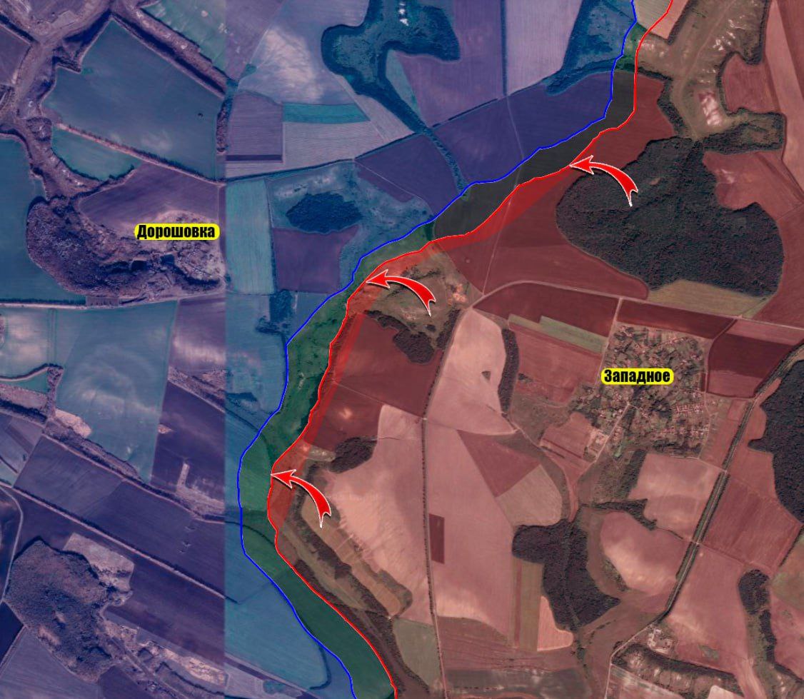 Отметим, что сложившаяся конфигурация фронта и давление на линии соприкосновения указывают на высокую вероятность отступления ВСУ за реку Бычок в случае сохранения наступательного темпа российских сил.
