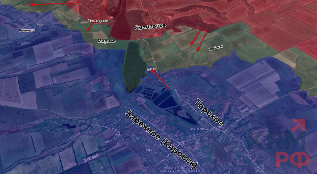 Также на правом берегу продолжаются атаки ВС РФ в районе Мирного и севернее Колодезей, в лесопосадках. Отмечаются попытки продвижения с целью охвата фланга и вытеснения противника из районов Заречного и Торского.