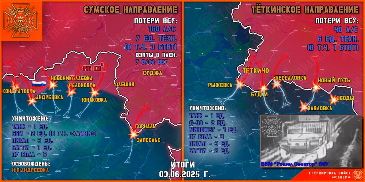 Атакуя из Сумской области, противник не бросает попыток закрепиться в Тёткино Курской области. Бои идут в районе кладбища и у очистных сооружений, где ВСУ копят силы для дальнейших атак. Постоянно попытки прорыва враг предпринимает в районе Нового Пути. Что касается наступления армии России в Сумской области, то МО РФ сообщило об освобождении Андреевки, также сообщают, что практически освобождена Новониколаевка. Бои идут уже в районе Варачино и у Яблоновки.