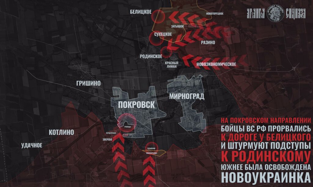 В настоящее время бои идут на подступах к Родинскому, а также севернее, где российским штурмовым группам удалось дойти до просёлочной дороги неподалеку от Белицкого.