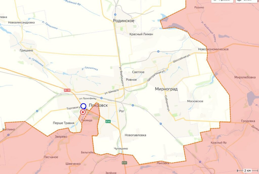На подступах к Чунишино ВС РФ предпринимают попытки прорваться на север, обходя оборону с направления трассы. В Лысовке продолжаются позиционные сражения: российские войска стремятся прорваться через лесополосы и балки, открывая путь к восточным окраинам Покровска (Красноармейска).