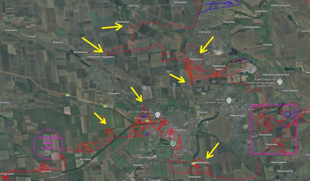 На Покровском фронте ВС РФ со стороны Котлино продвинулись по «коридору» между автомобильной дорогой и ж/д на Покровск. На Добропольском выступе ВС РФ перерезали дорогу на Доброполье южнее Красного Лимана и Родинского. В районе Никаноровки и Дорожного очень тяжёлые бои. Так же трудно идет противостояние в южной части Владимировки, а в северной ВС РФ практически отрезали посёлок от Шахово, где также напряженное сражение. Со стороны Полтавки наши части стараются замкнуть окружение подразделений ВСУ во Владимировке и Шахово. По данным с мест ВС РФ удалось вдоль дороги Шахово-Грузское выйти на подступы к Грузскому. По линии Грузское — Весёлое и Золотой Колодезь идут крайне тяжёлые бои.