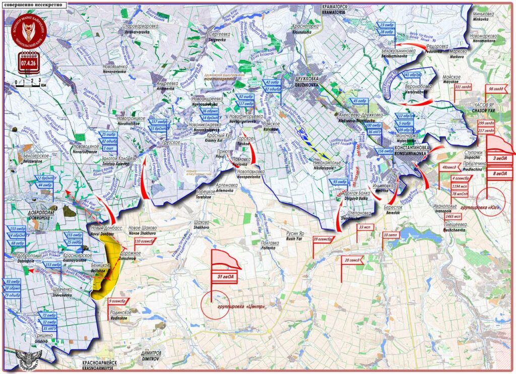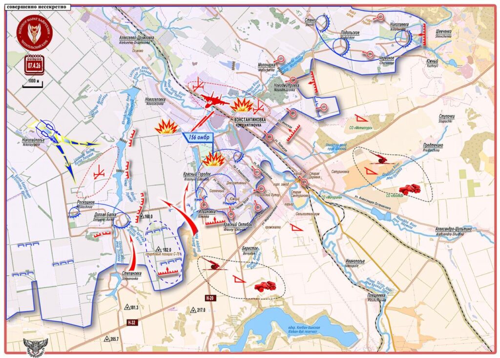 7 апреля были нанесены авиационные удары управляемыми ФАБами крупного калибра по пунктам управления, в частности по ПУ 156 мехбригады, и по позициям ВСУ в городе Константиновка. Напряженные бои идут на линии Степановка — Красный Городок. Враг предпринимает попытки контратаковать с направления Райское – Николайполье на район Долгая Балка — Бересток, во фланг подразделениям, штурмующим город с юго-запада.